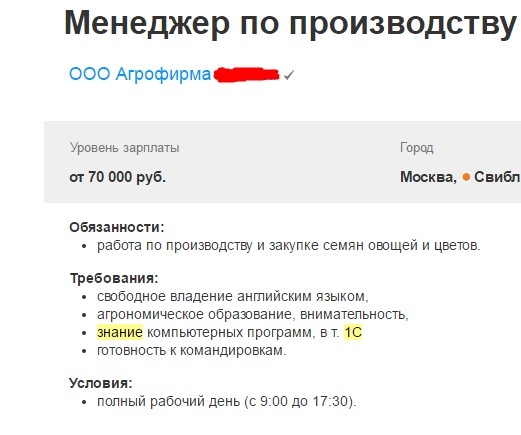 На этих двух скриншотах видно, что зачастую работодатель не хочет долго объяснять, каких конкретно знаний он ждет от Вас, поэтому так и пишет – «Знания 1С». Конечно, так поступает не каждый работодатель, некоторые указывают точное название программы «1С», в которой будет работать специалист.