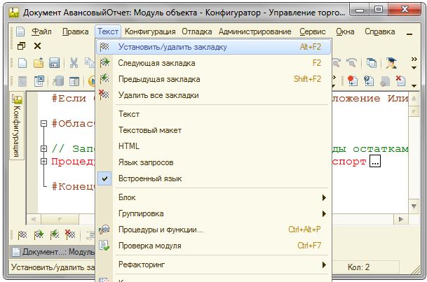 Уже многие поколения версий платформы «1С:Предприятие» поддерживают работу с закладками-метками в тексте модуля.