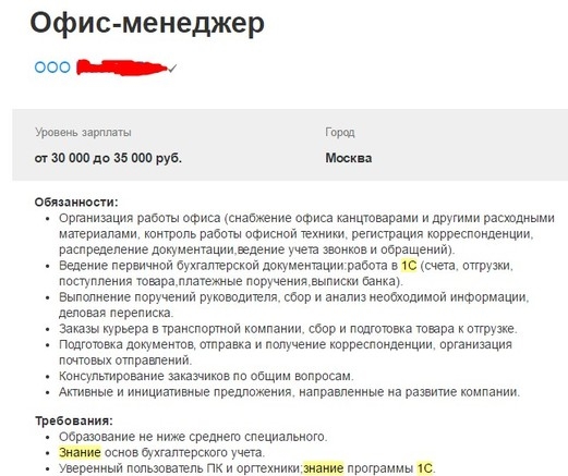 На этих двух скриншотах видно, что зачастую работодатель не хочет долго объяснять, каких конкретно знаний он ждет от Вас, поэтому так и пишет – «Знания 1С». Конечно, так поступает не каждый работодатель, некоторые указывают точное название программы «1С», в которой будет работать специалист.